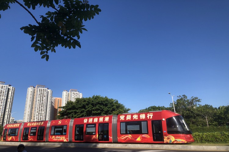 黨建主題列車在原有裝飾基礎(chǔ)上,在車身張貼“奮進(jìn)自貿(mào)港·黨員先鋒行”黨建品牌名稱,在車頭張貼椰風(fēng)海韻特色的黨建品牌符號,讓中交海投黨建品牌標(biāo)識始終行程在路上,走進(jìn)三亞市民群眾身邊。